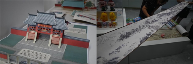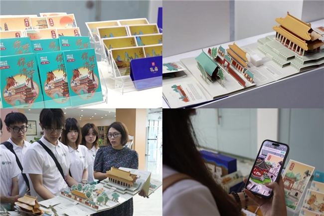 实践团在讲解员引导下在公司文化成果展厅开启文化探索之旅。在展览区里,以孔庙建筑、运河胜景为原型的立体折叠书吸引众人目光,公司研发人员吴海英拿起一本《走进孔子》折叠书,细致讲解:“这本作品以曲阜孔庙空间格局为蓝本,通过分层折叠工艺,将棂星门、圣时门等标志性建筑融入书页,把静态文化符号转化为可触摸、可探索的立体场景,让儒家文化载体‘活’起来。”同学们围拢聆听,透过书页,感受齐鲁建筑文化与现代工艺碰撞的魅力。