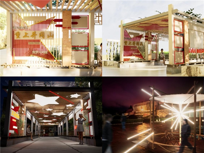 围绕红色文化学习成果,接着发挥建筑学专业优势,小组针对基地关键节点开展“一地一案”设计。团队在基地餐厅门口小广场、通往篮球场的小道、通往食堂的玻璃廊道等关键节点,原创设计红色文化夜景灯光装置,如迸星台夜游博物亭、“星火燎原”灯光装置等;改造现有室外灯具与构筑物;改造基地玻璃廊道形成井冈山精神沉浸式红色文化体验空间;整合出一条连贯的沉浸式红色文化夜游主线。通过光影艺术的创新表达,活化红色历史场景,增强革命精神的夜间感染力,为参观者打造沉浸式、互动性强的红色教育新体验。解决了基地夜游发展的痛点,助力井冈山红色文旅发展,传承红色文脉。