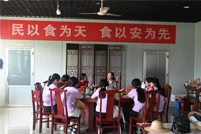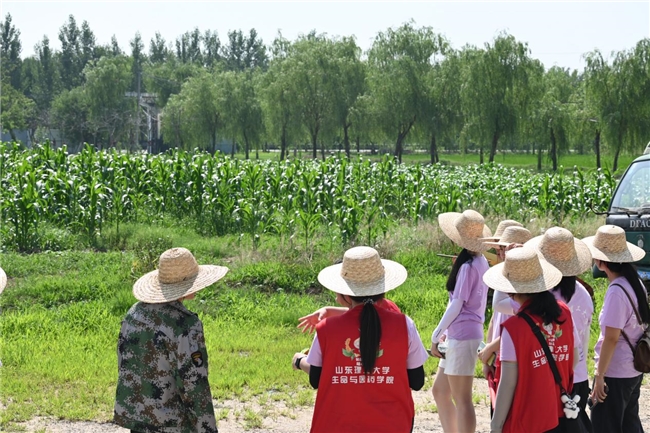 成员在与荒土地公司理事长、高青知名爱心科技助农企业家-孙朝霞女士的交流过程中,对公司及农场的整体情况有了较为全面的了解。目前,公司已经构建了“粮、果、蔬”多元种植体系,打造高附加值农业产业链,如当前主营的花田大米:利用四月份油菜花季的秸秆还田技术,结合菌肥发酵工艺,实现“花香入稻、肥田养米”,在实现生态资源充分利用的同时,还可以提升稻米风味与营养价值。