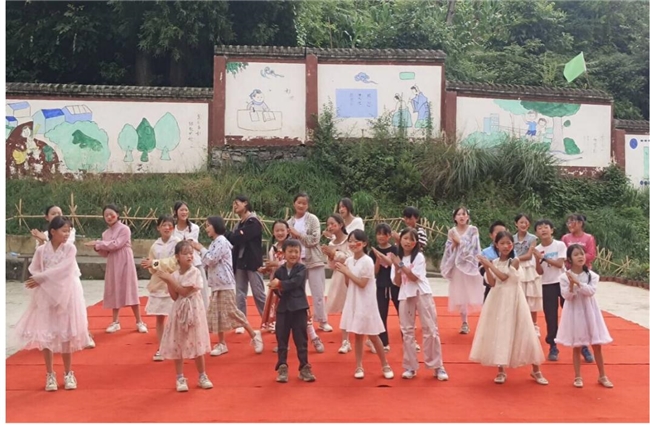 文艺汇演中,彝族舞《哈尼宝贝》率先登场,孩子们踩着明快节奏跃动,裙摆飞扬间绽放民族文化的鲜活生命力与民族文化魅力;合唱《金孔雀轻轻跳》用清澈的童声淌唱出了孩子们对美好生活的纯真向往;话剧《牵挂》则通过再现支教生活中的送医、冒雨家访的场景,引发全场共鸣。最后,全体师生齐唱《紫荆花盛开》,歌声回荡在山间,表达了对未来的美好期待。