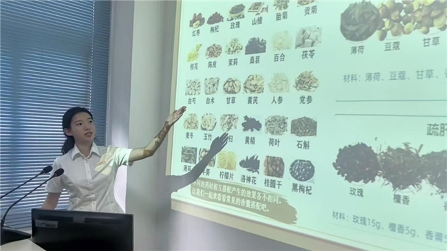 咫尺识百草,香囊传千年。实践首日,队员们在社区活动中心开设了妙趣横生的“中医药香囊小讲堂”。屏幕上,生动的图文展示了中医药香囊的悠久历史,及其在驱疫避秽、安神助眠等养生保健方面的独特功效。