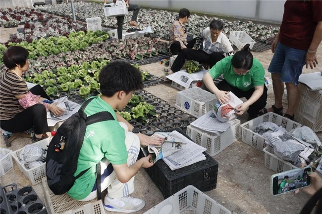 图为实践队队员体验仙人球出口包装流程。方博文 供图、