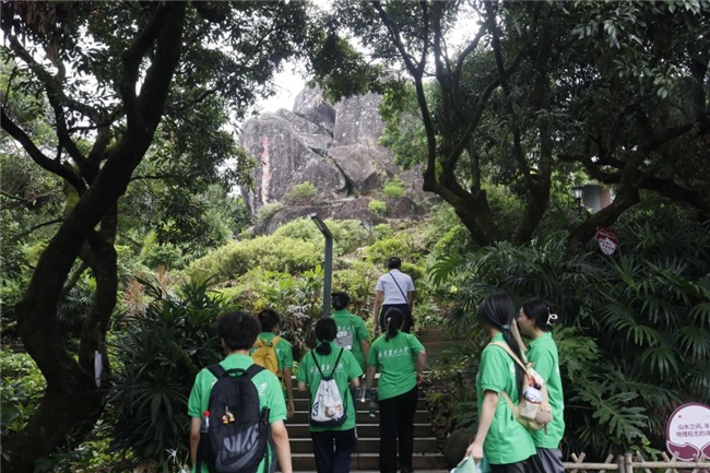 图为实践队员在荔枝博物馆讲解员带领下登顶荔枝海鸡母石,俯瞰荔枝海景观。 方博文 供图