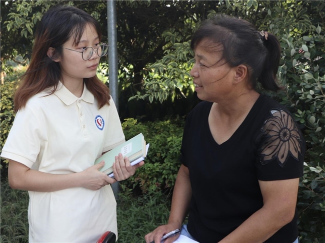 图为实践团负责人贺喜英采访当地村民进行环保群众调研。彭晨 供图