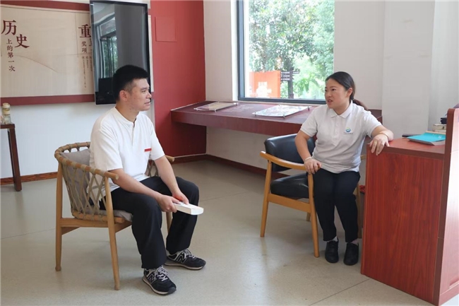 图为实践团指导老师林涵与人民文学出版社书屋管理员交流探讨书屋发展现状。彭晨 供图