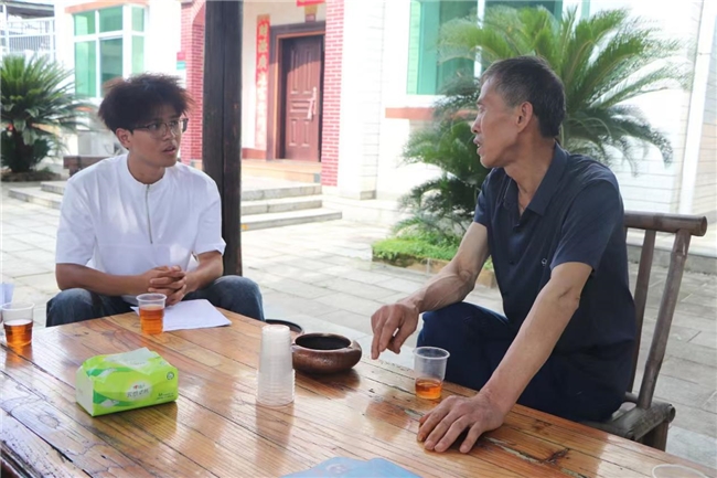 图为实践团成员马子翔访谈采访环保组长邓春生进行当地环保主题调研。彭晨 供图