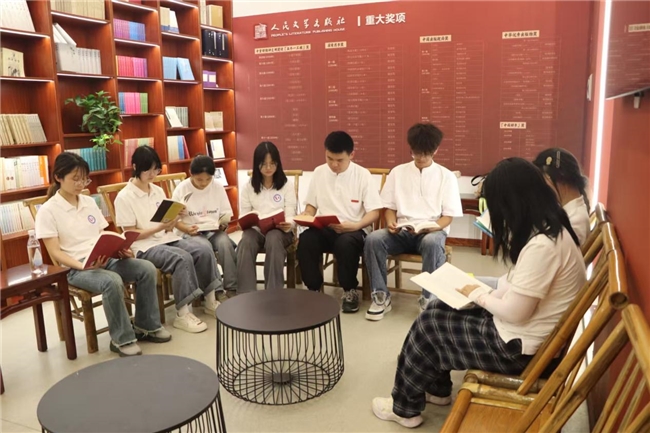 图为实践团成员在人民文学出版社书屋开展读书会活动。彭晨 供图