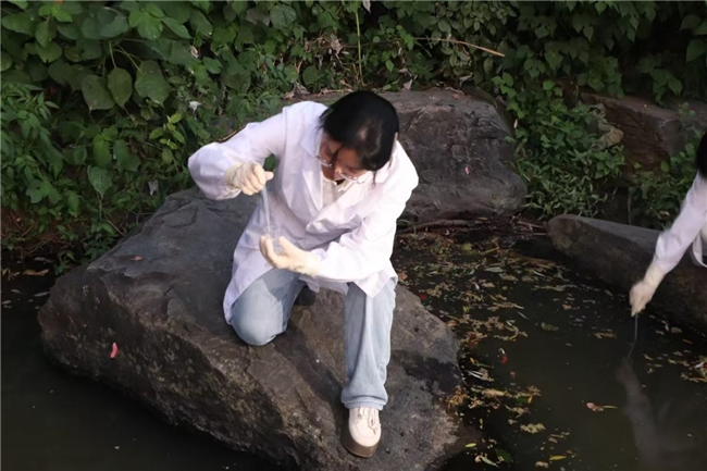 图为实践团成员李荣荣在清溪河进行水质检测取样。彭晨 供图