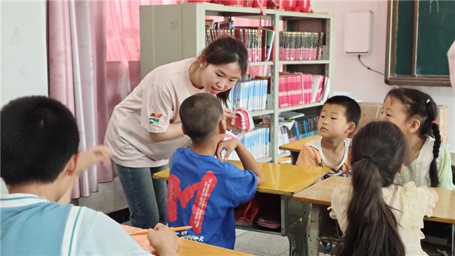 实践队员用口腔模具向小朋友讲解普通话发音方法
