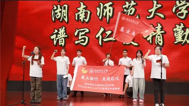 在风采展示环节,湖南师范大学实践团以一首深情激昂的诗歌朗诵《薪火之路:星城到井冈》惊艳全场,“独立寒秋,湘江北去。问苍茫大地,谁主沉浮?这是星城的叩问,是百年前觉醒的火种!”诗句中既有对当时早期知识分子的革命初心的回望,更有新时代青年的使命担当。“我们重走这薪火之路。以精勤传承薪火,以仁爱书写中国:世上无难事,只要肯登攀!”铿锵有力的朗诵赢得全场阵阵掌声,展现了湖师大学子的昂扬精神风貌。