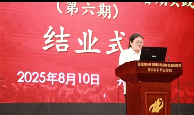 总结会议上,湖南师范大学历史文化学院王妍作为学员代表发言,分享了实践团的感悟与收获,并代表团队领取结业证书。在发言中说到“井冈山精神不是教科书上的文字,而是镌刻在青年骨子里的行动明灯。我们将带着这份‘井冈情’回到校园,让艰苦奋斗的精神融入学习生活中,让井冈山精神在新时代绽放新光芒。”