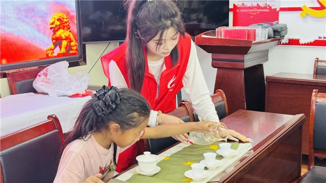 在传统茶艺展示课上,志愿者优雅地演绎茶叶鉴别、冲泡技巧与品茗礼仪,每一步都透露出对传统文化的敬畏。藏族小朋友们围坐茶桌,聚精会神地观察,并不时发出惊叹。在志愿者引导下,孩子们亲身体验“茶童”角色,指尖触碰茶具的温度,品味茶文化的深厚韵味。