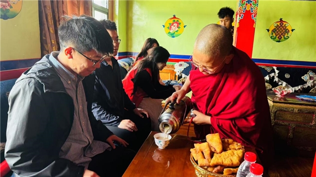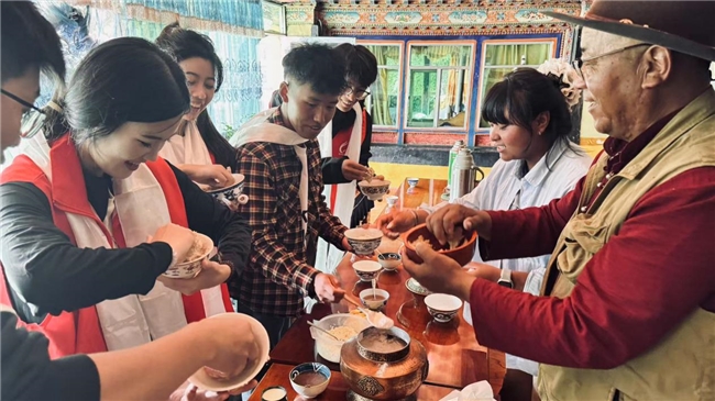 为了更深入了解当地生活,实践团成员们深入藏族学生家庭走访。一踏入家门,志愿者们便感受到藏族人民的热情与淳朴,洁白的哈达披上肩头,传递着最诚挚的欢迎与祝福。志愿者们与家长亲切交谈,详细了解家庭生活状况。他们参观了藏族家庭的经堂,感受藏传佛教的庄严与神秘;围坐在餐桌旁,品尝地道的酥油茶、糌粑和青稞酒,对藏族的饮食文化和生活习俗有了更真切、深入的体会。