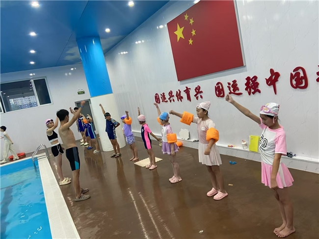 游泳馆内,一面鲜艳的五星红旗悬挂在墙上,“国运兴体育兴 国运强中国”的红色大字格外醒目,营造出浓厚的体育氛围。实践队员站在泳池边,带领着身着各色泳衣、戴着泳帽和浮袖的小朋友们开始热身。“手臂伸直,像这样慢慢向上举,再放下,重复几次。”队员一边示范,一边用清晰易懂的语言指导着。小朋友们认真地模仿着动作,小脸上满是专注,稚嫩的手臂在空中划出一道道可爱的弧线。