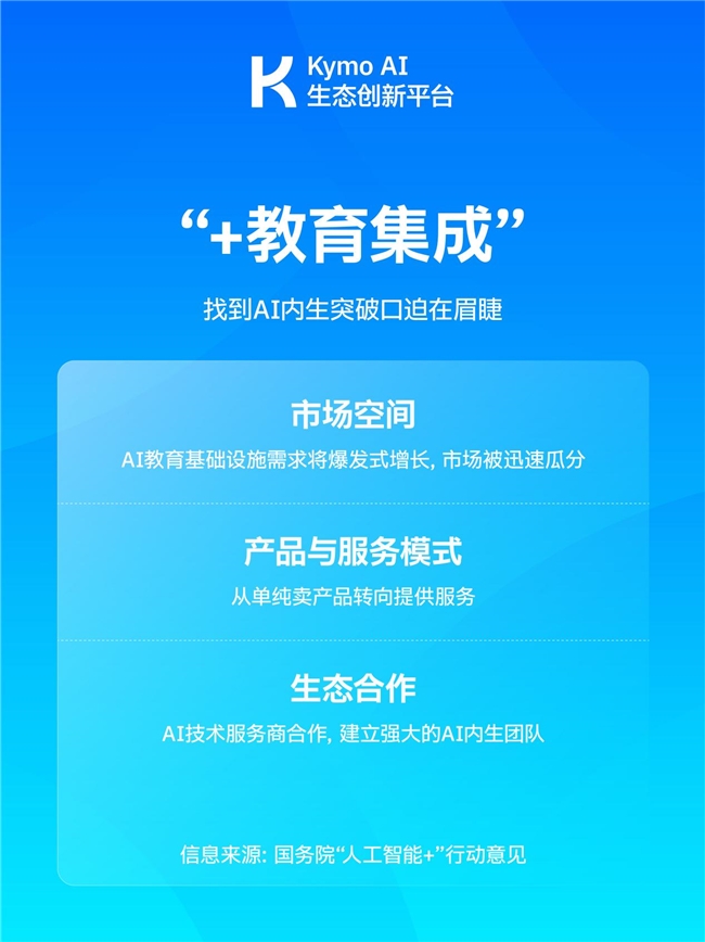 Kymo、教育集成商以及学校的AI+教育实践,不仅响应8月26日国务院印发的《关于深入实施“人工智能+”行动的意见》。政策明确鼓励AI与教育深度融合,三方的联动,不仅紧跟国家导向,更提前跑通了从教育类智能体开发到落地的全流程。