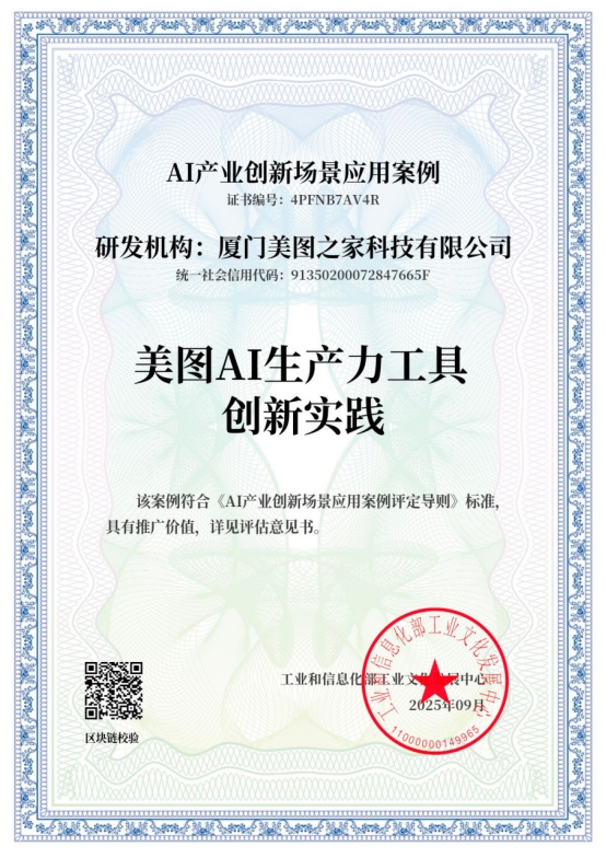 11月4日,2025工业文化发展大会在上海举办,工信部工业文化发展中心在会上颁发了“AI产业创新场景应用案例”证书。通过场景应用、技术维度、市场潜力、用户体验、社会效益、风险控制六大指标筛选评估,美图AI生产力工具创新实践被评为“AI产业创新场景应用案例”。