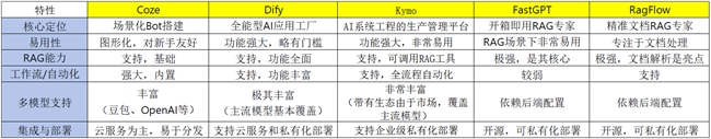 下面是扣子、 Dify、Kymo、FastGPT、RAGFlow的技术优势对比: