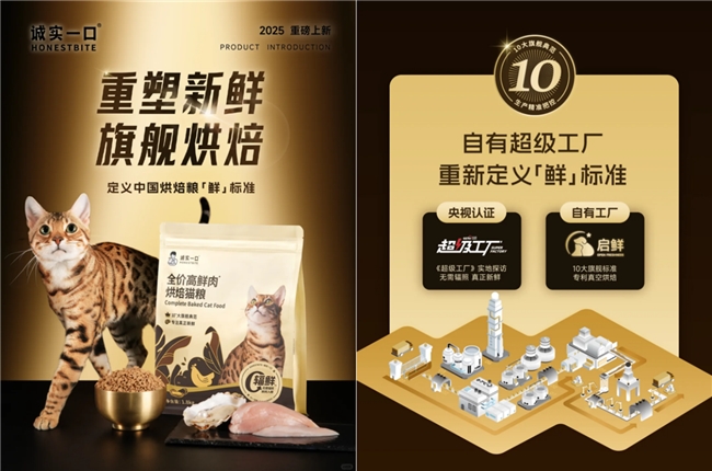据悉,本届它博会,诚实一口将重点展示年度重磅新品黑金高鲜肉烘焙猫粮。该产品是诚实一口启鲜超级工厂旗舰生产的烘焙猫粮,由央视认证的好猫粮。不仅如此,该产品更是一款国际高品质标准的“0辐照”烘焙粮,实现从标准、营养到品质的全面升级。