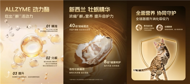 ALLZYME动力酶,联合美国微量元素营养专家奥特奇,针对高蛋白安全高效吸收专研,复合多酶协同作用,分解脂肪、蛋白质等大分子营养,能够提升消化效率,呵护肠道健康。新西兰牡蛎精华,甄选新西兰纯净海域中的珍稀牡蛎,富含牛磺酸和牡蛎糖原,能够帮助猫咪提升代谢与吸收能力,增强免疫力。益生链与谷氨酰胺,可以促进有益菌的增殖与肠道菌群平衡,增强肠道屏障。