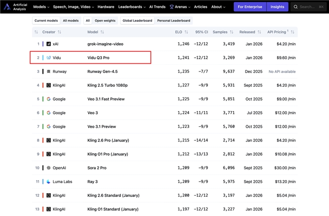 旗下多模态大模型 Vidu ,在国际权威AI基准测试机构Artificial Analysis 最新公布的榜单中,Vidu Q3 排名中国第一,全球第二,比肩马斯克xAI Grok,超越 Runway Gen-4.5 ,Google Veo3.1和 OpenAI Sora 2。