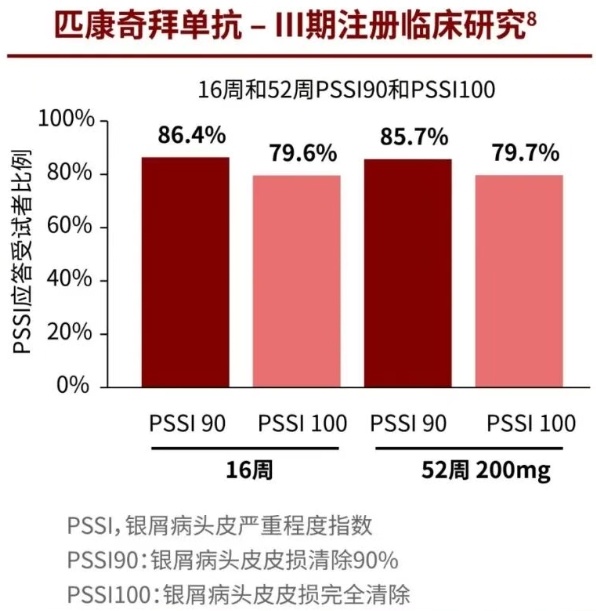 由于头皮银屑病对患者影响大,且常规治疗难以获得良好的治疗效果。因此国内外银屑病治疗指南均建议,如果患者存在头皮等特殊部位受累,应该尽早启动系统治疗(包括传统口服药、生物制剂及小分子靶向药)。值得关注的是,近年来生物制剂发展迅速,例如针对白细胞介素17A(IL-17A)的司库奇尤单抗、针对白细胞介素23(IL-23)的古塞奇尤单抗和匹康奇拜单抗等,为患者带来了新的治疗选择。相关临床研究显示,部分生物制剂在头皮银屑病相关临床研究中呈现出一定的改善趋势,如匹康奇拜单抗在中重度斑块银屑病中的疗效与安全性:一项随机、双盲、三期CLEAR-1试验显示,接近80%的受试者使用匹康奇拜单抗治疗16周头皮皮损实现了完全清除。该数据仅适用于研究纳入的受试者人群,临床应用需结合患者个体情况。