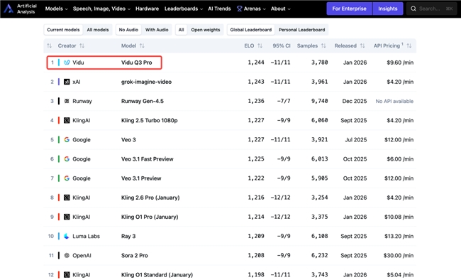 2 月 10 日,国际权威 AI 基准测试机构 Artificial Analysis 发布最新评测榜单。在该榜单中,Vidu Q3 位列 全球第一,综合表现超越 xAI Grok、Runway Gen-4.5、Google Veo 3.1 以及 OpenAI Sora 2 等一众国际主流模型,展现出全球领先的技术与生产级能力。