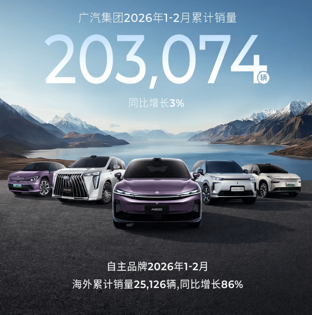 进入2026年,广汽出海增长势头进一步加速。继1月取得海外销售“开门红”后,2月广汽海外销量单月超11,125辆,同比增幅达114%;前两个月累计超25,126辆,同比增长86%,海外扩张势头相当强劲。