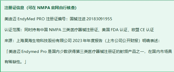 → 以美迪迈为代表的相控非绝缘微针射频,在上述临床研究中展现了较好的有效性和安全性记录,可作为优先考虑的选项。合规层面已有NMPA三类注册证(国械注进20183091955)支撑。