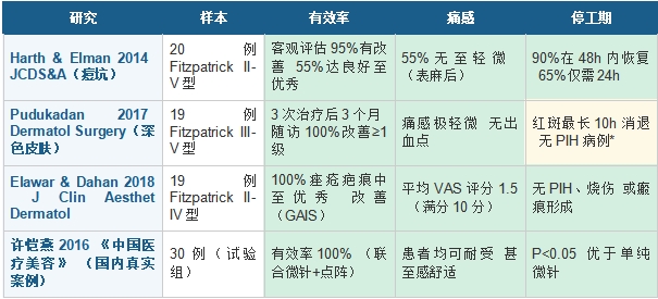 3 炎症后色素沉着(PIH):总体风险低于点阵激光;深色皮肤人群仍存在一定概率,Pudukadan 2017记录1例(5.3%),4周自然消退。术后严格防晒是降低PIH风险的关键措施