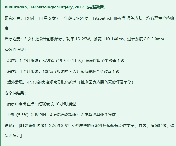 2. Pudukadan D. Treatment of Acne Scars on Darker Skin Types Using a Non-Insulated Smooth Motion, Electronically Controlled Radiofrequency Needling Device. Dermatologic Surgery. 2017.