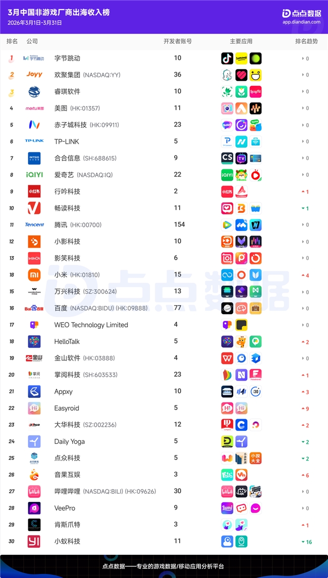 观察点点数据发布的中国非游戏厂商出海收入榜,AI视觉创意赛道的厂商同样名列前茅,字节跳动和美图公司始终是该榜单的常客。