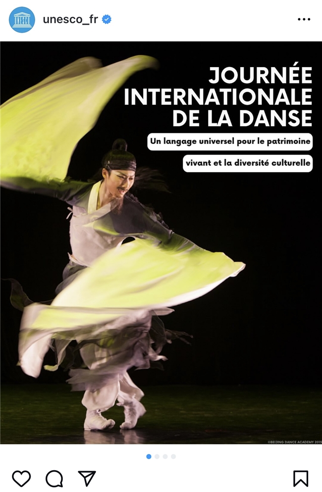 2020年,时任联合国教科文组织总干事奥德蕾·阿祖莱女士在国际舞蹈日当天特别致辞,强调舞蹈对全人类的重要性。联合国教科文组织前总干事松浦晃一郎先生也曾为国际舞蹈日致辞,并在舞蹈日当天,在国际舞蹈委员会主席的见证下,授予古巴著名舞蹈家阿莉西亚·阿隆索联合国教科文组织亲善大使一职。去年,在国际舞蹈委员会的建议与遴选下,联合国教科文组织官方社交媒体发布了国际舞蹈日专题图文,中国古典舞被选为封面形象。